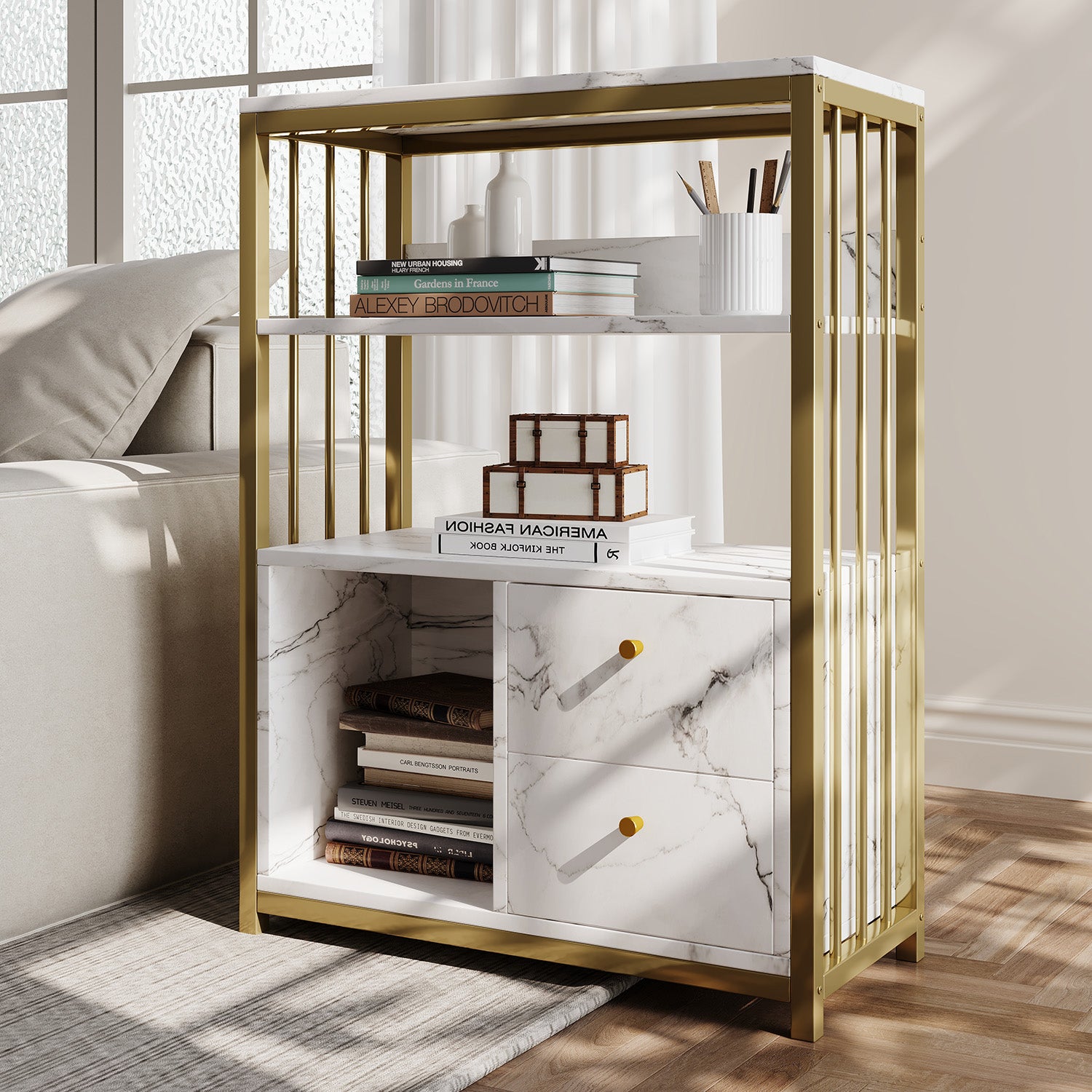 The clean lines of the marble-patterned top, paired with carefully crafted brass handles and a slatted design, evoke a sense of understated luxury.
