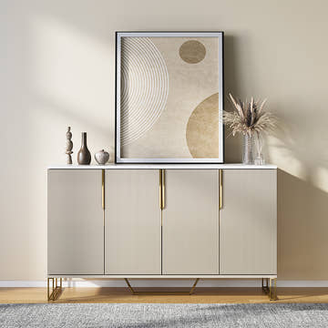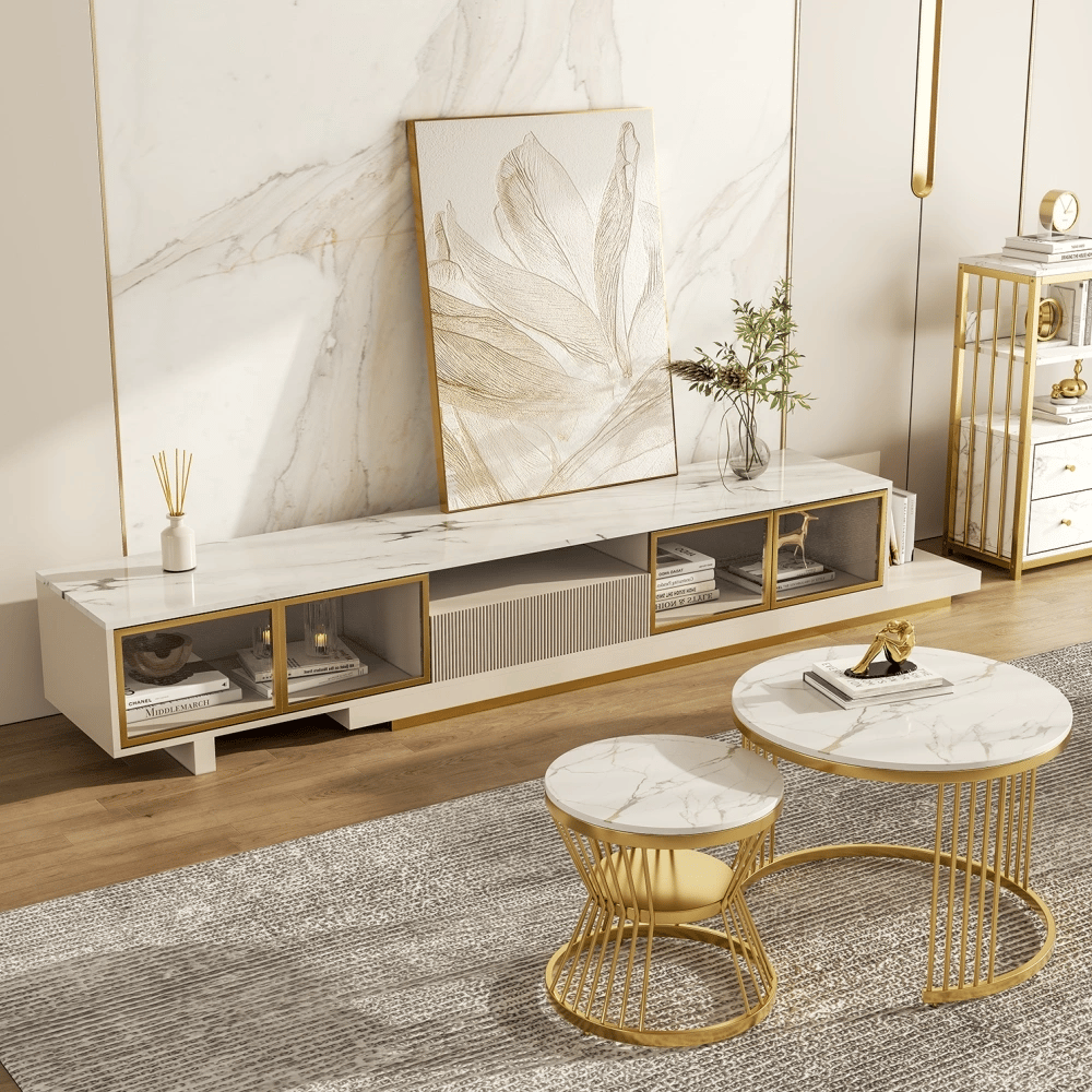 Marble-patterned surfaces paired with a brass-colored frame create a luxurious aesthetic for any space.