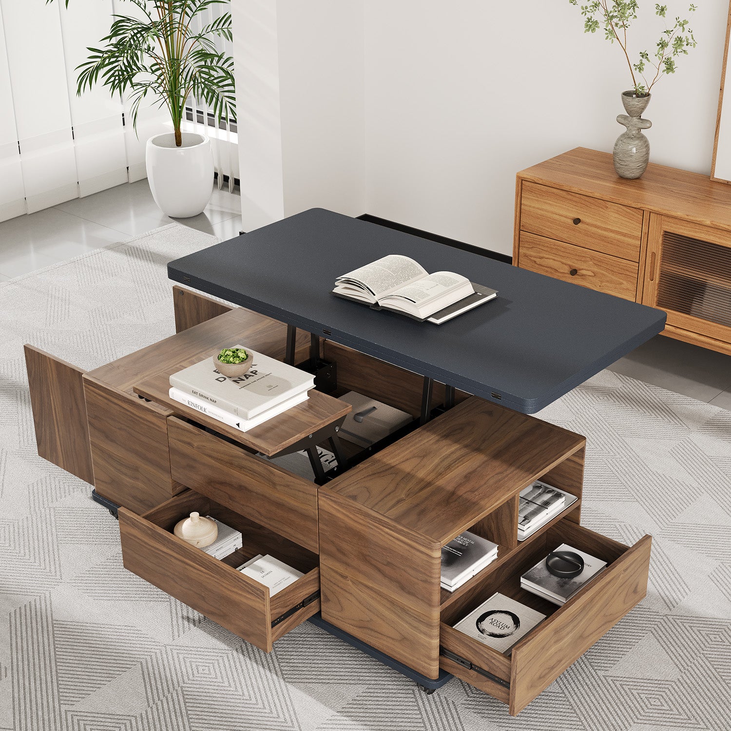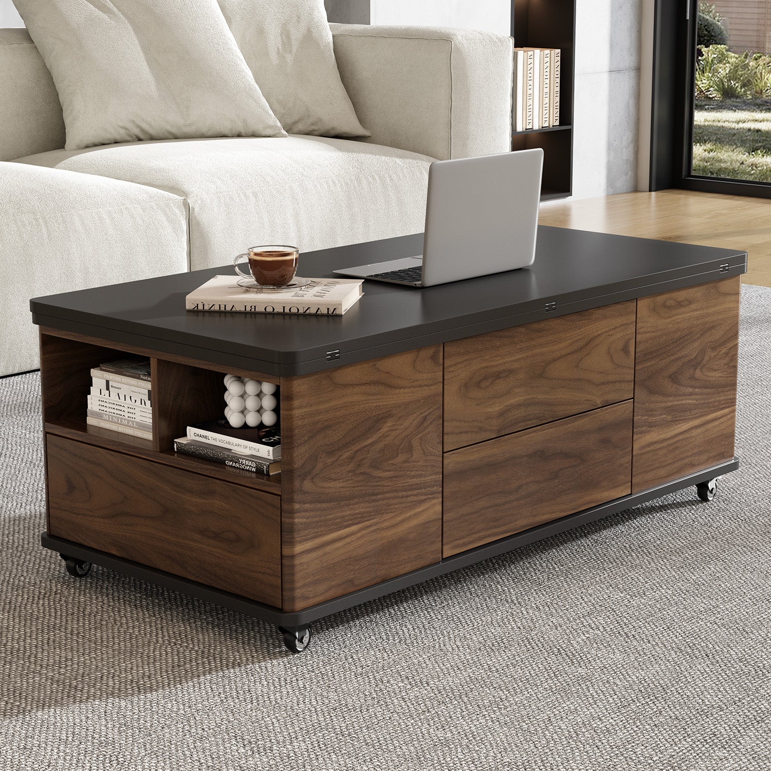 This coffee table is more than meets the eye. With 70% tool-free assembly, it transforms from a coffee table to an office desk or dining table. It offers abundant storage with drawers, cubbies, and a hidden compartment, plus lockable wheels for easy mobility. Elegant walnut and black veneers complete the look, blending style with versatility.