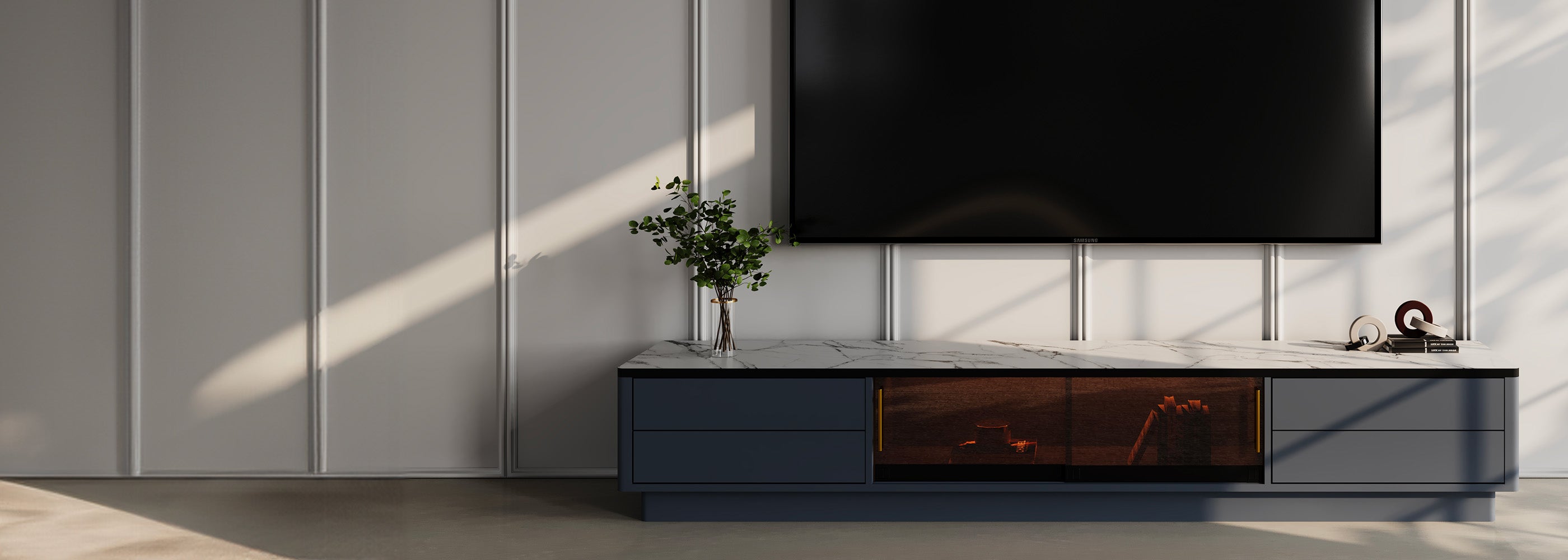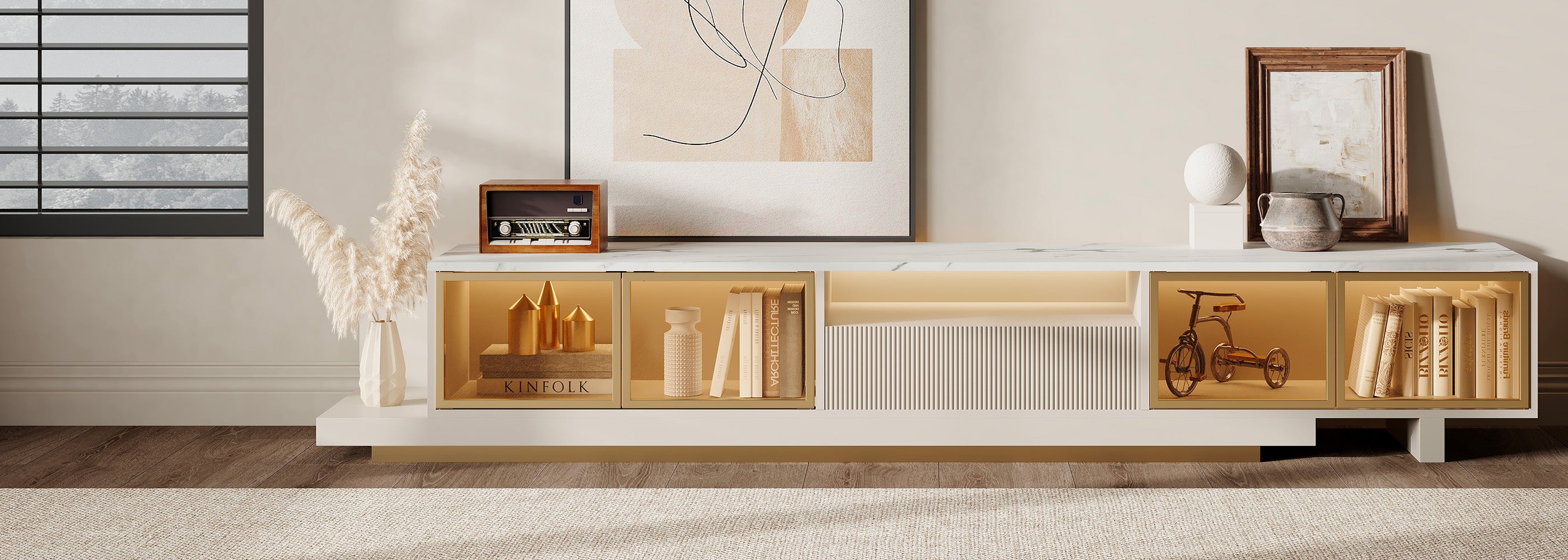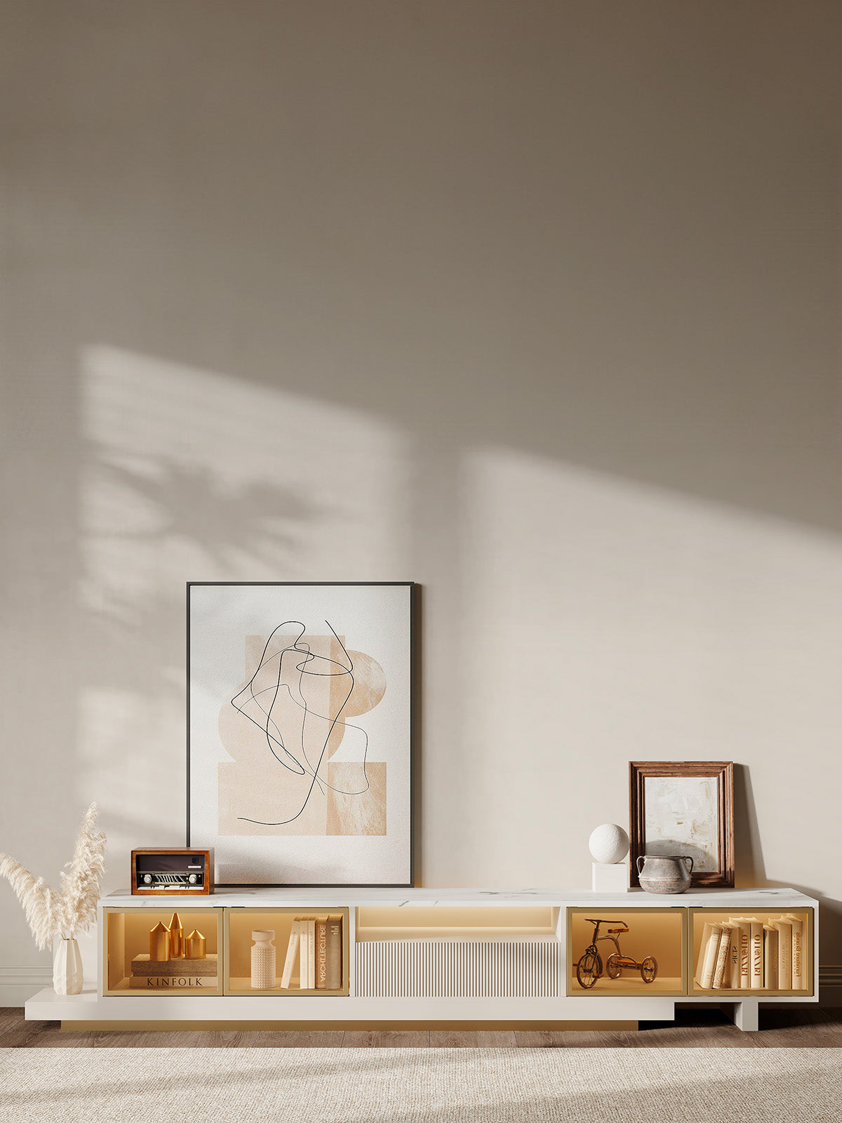 Whether you’re looking for a warm, inviting atmosphere or a vibrant burst of color, this modern TV stand sets the perfect mood. The amber glass doors gently diffuse the light, casting a subtle, elegant glow that adds warmth and emotion to your living room.