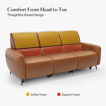 Featuring a sleek double-curved design, striking contrast 'moccasin' stitching, and a personalized adjustable reclining angle on the right seat, this sofa invites relaxation at first glance.