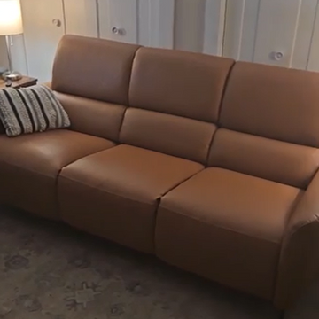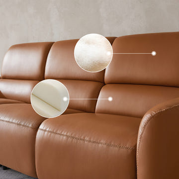 With its elegant double-curved design, contrasting 'moccasin' stitching, and adjustable reclining angles, this sofa instantly invites relaxation at first glance.