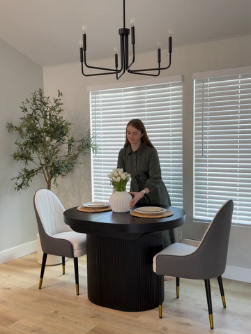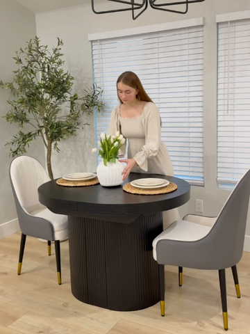 This Modern-style extendable dining table showcases a sleek black finish. Crafted from premium MDF and solid wood, it ensures durability and stability. Its versatile round or oval shape adds a touch of minimalist elegance, making it the perfect centerpiece for any dining space.