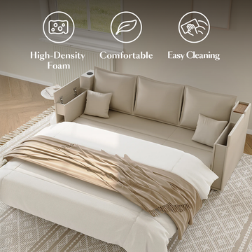 A marvel of versatility, this piece effortlessly transitions from a three-seater sofa to a roomy bed in seconds, perfect for compact living spaces or hosting friends. Each armrest features a built-in storage compartment with a dust-resistant padded cover, ideal for stashing blankets or accessories. Two additional storage boxes provide even more organizational space. The left armrest features a Bluetooth speaker for immersive sound and dual charging ports (Type-C and USB) to keep your devices powered and within arm’s reach. Every detail—from the seamless conversion mechanism to the hidden storage solutions—is thoughtfully crafted to maximize utility without compromising on style.