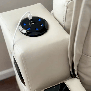 The left armrest features a Bluetooth speaker for immersive sound and dual charging ports (Type-C and USB) to keep your devices powered and within arm’s reach.
