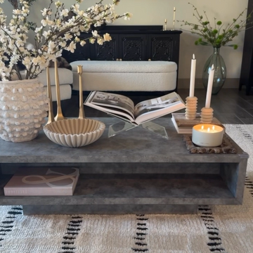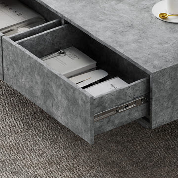 This coffee table features an easy and convenient setup that requires only the installation of the base. Equipped with 2 push-to-open drawers and a semi-open storage space, it meets all your storage needs. The cement gray marble-patterned veneer provides a scratch-resistant and easy-to-maintain surface while adding a touch of modern artistry to your space.