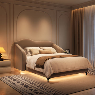 This bed features an enveloping winged headboard that creates a sense of cozy enclosure, providing unparalleled comfort. The thickened cushioning on the headboard enhances support, offering excellent back support when sitting up in bed, perfect for reading or relaxing. An under-bed LED light adds a soft, ambient glow, creating a peaceful atmosphere while providing gentle illumination for nighttime comfort. The sleek, curved lines of the design bring a touch of modern artistry to the overall aesthetic, blending functionality and beauty for a stylish addition to your bedroom.