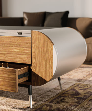 This lift-top coffee table combines walnut, dark gray, and metallic accents, creating a sleek and modern design that adds both style and functionality to your living space.