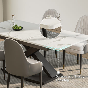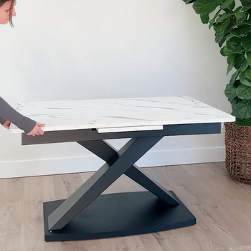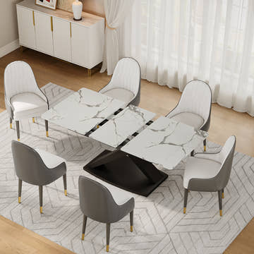 This stylish extendable dining table seamlessly blends modern design with practicality, making it a perfect addition to any dining space. Crafted from premium MDF, iron, and a marble white finish, it not only offers functionality but also enhances the aesthetic appeal of your home.